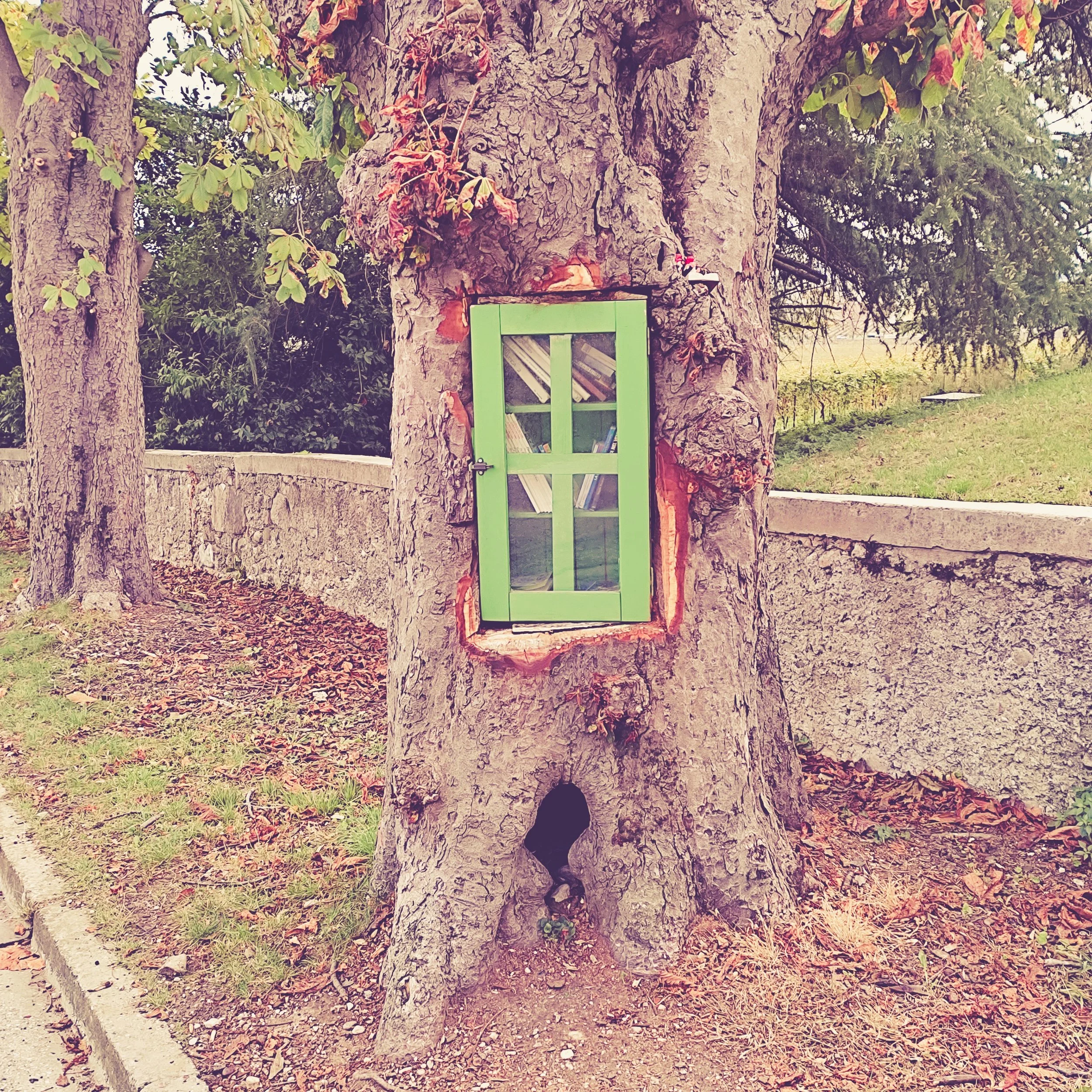 Cosa ancor più bella, mi capita di tanto in tanto d’imbattermi in un’idea insolita e generosa, partita e concretizzata da qualcuno per la gioia di altri, per lo più escursionisti. Tempo fa, durante una delle mie scampagnate, ho notato una finestrella colorata di verde spiccare in mezzo al tronco di un albero.